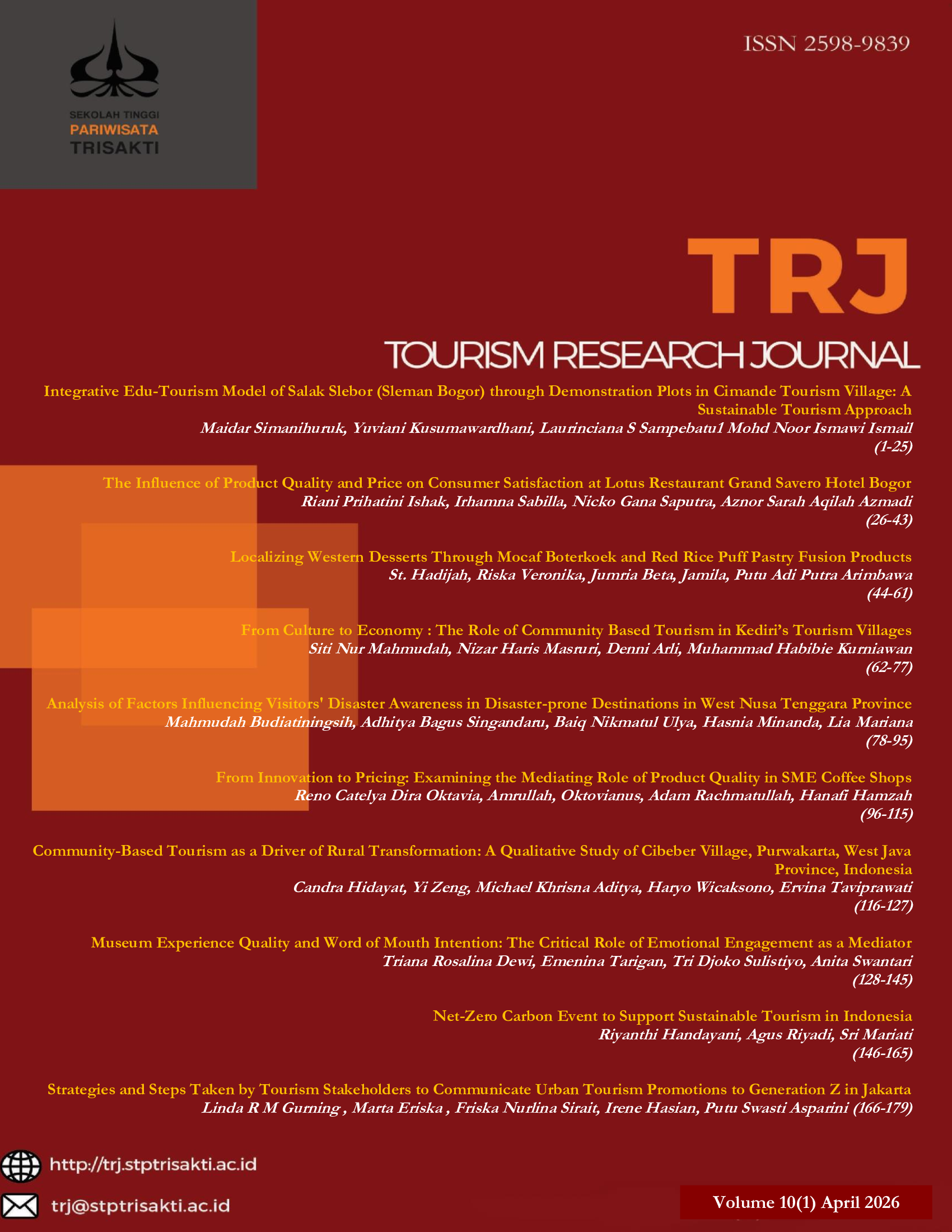 TRJ (Tourism Research Journal) has been accredited by National Journal Accreditation (ARJUNA) Managed by Ministry of Education, Culture, Research, and Technology, Republic Indonesia with Third Grade (Sinta 3)